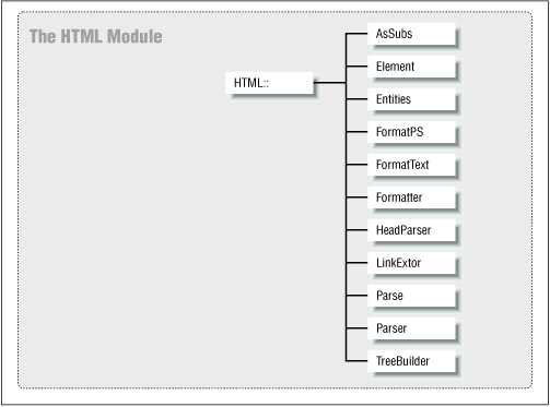 In the context of web clients, some modules in LWP are more useful than others. In this book, we cover LWP, HTML, HTTP, and URI. HTTP describes what we're looking for, LWP requests what we're looking for, and the HTML module is useful for interpreting HTML and converting it to some other form, such as PostScript or plain text. The URI module is useful for dissecting fully constructed URLs, specifying a URL for the HTTP or LWP module, or performing operations on URLs, such as escaping or expanding.