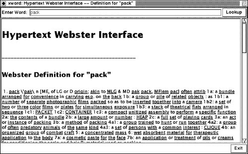 There are a few other things that could be added to xword to make it even nicer. A Back button would be useful, so that after you looked up 10 or so words, you could click on Back to take you backwards through your selections. And how about a list of optional dictionary web servers, in case one is sometimes slow or doesn't respond? These will be left as exercises for the reader.