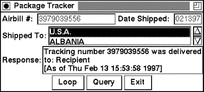 my $pkg_tracker = new FedEx $url, $email;my $loop_id;$airbill_entry->focus;MainLoop;One last thing before we start the MainLoop to handle the GUI interaction. (Remember, this is different from our query loop.) We have to create a FedEx object and save a reference to it. Now when we do a query, we can utilize this package to do the hard work for us:
