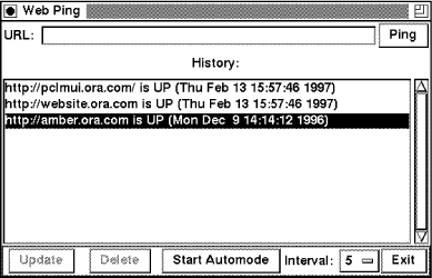 $button_f->Button(-text => "Exit",-command => \&exit_program)->pack(-side => "right",-anchor => "e");my $entry_f = $mw->Frame;$entry_f->pack(-side => 'top', -anchor => 'n', -fill => 'x');$entry_f->Label(-text => "URL: ")->pack(-side => 'left',-anchor => 'w');my $entry = $entry_f->Entry(-textvariable => \$url);$entry->pack(-side => 'left', -anchor => 'w', -expand => 'y',-fill => 'x');$entry_f->Button(-text => "Ping",-command => \&add_site)->pack(-side => 'left',-anchor => 'e');$entry->bind('<Return>', \&add_site);my $list_f = $mw->Frame;$list_f->pack(-side => 'top',-anchor => 'n',-expand => 'yes',-fill => 'both');$history_label = $list_f->Button(-text => "History:",-borderwidth => 2,-relief => "flat");$history_label->pack(-side => 'top', -anchor => 'n', -fill => 'x');my $scroll = $list_f->Scrollbar;my $list = $list_f->Listbox(-selectmode => 'extended',-yscrollcommand => ['set', $scroll]);$scroll->configure(-command => ['yview', $list]);$scroll->pack(-side => 'right', -fill => 'y');$list->pack(-side => 'left', -expand => 'yes', -fill => 'both');## Bind Listbox so that the "Update" button is enabled whenever a user## has an item selected.$list->bind('<Button-1>', sub {my @selected = $list->curselection;if ($#selected >= 0) {$update_bttn->configure(-state => 'normal');$del_bttn->configure(-state => 'normal');} else {$update_bttn->configure(-state => 'disabled');$del_bttn->configure(-state => 'disabled');}} );if (open(FH, "$site_file")) {while (<FH>) {chomp;$url = $_;&add_site;}close FH;}$url = "";Here is where we take advantage of a "remembering" file. When the program exits, we will save the current list of sites to this file. This way, when the program is started the next time, it looks exactly as it did the last time we ran it--except that the program will have updated the list of sites with the current status.